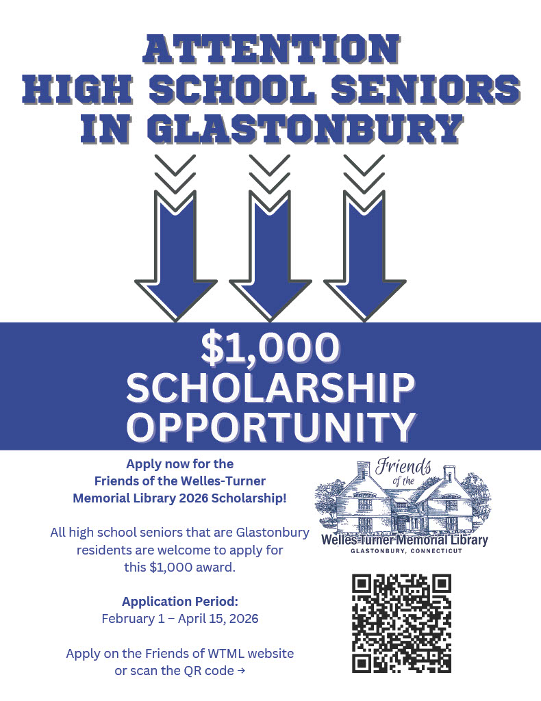Scholarship. The Friends of the Welles-Turner Memorial Library 2026 Scholarship application was available on February 1st. The application period will be from 2/1/26 through 4/15/26. The application will be available through the GHS Guidance web page and the Friends face book page and the Friends website. Any senior in high school that lives in Glastonbury is eligible to apply for the $1,000 award.