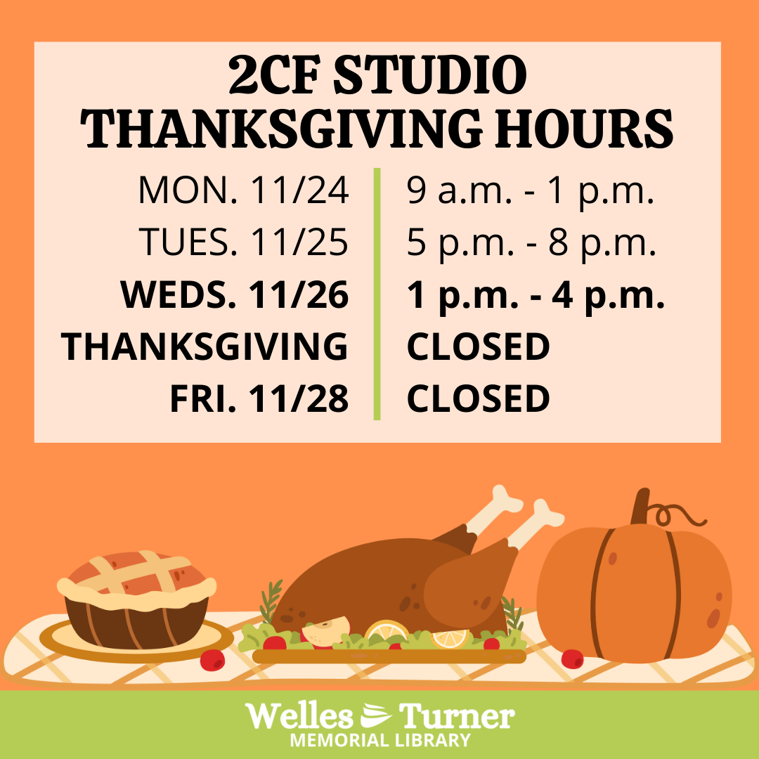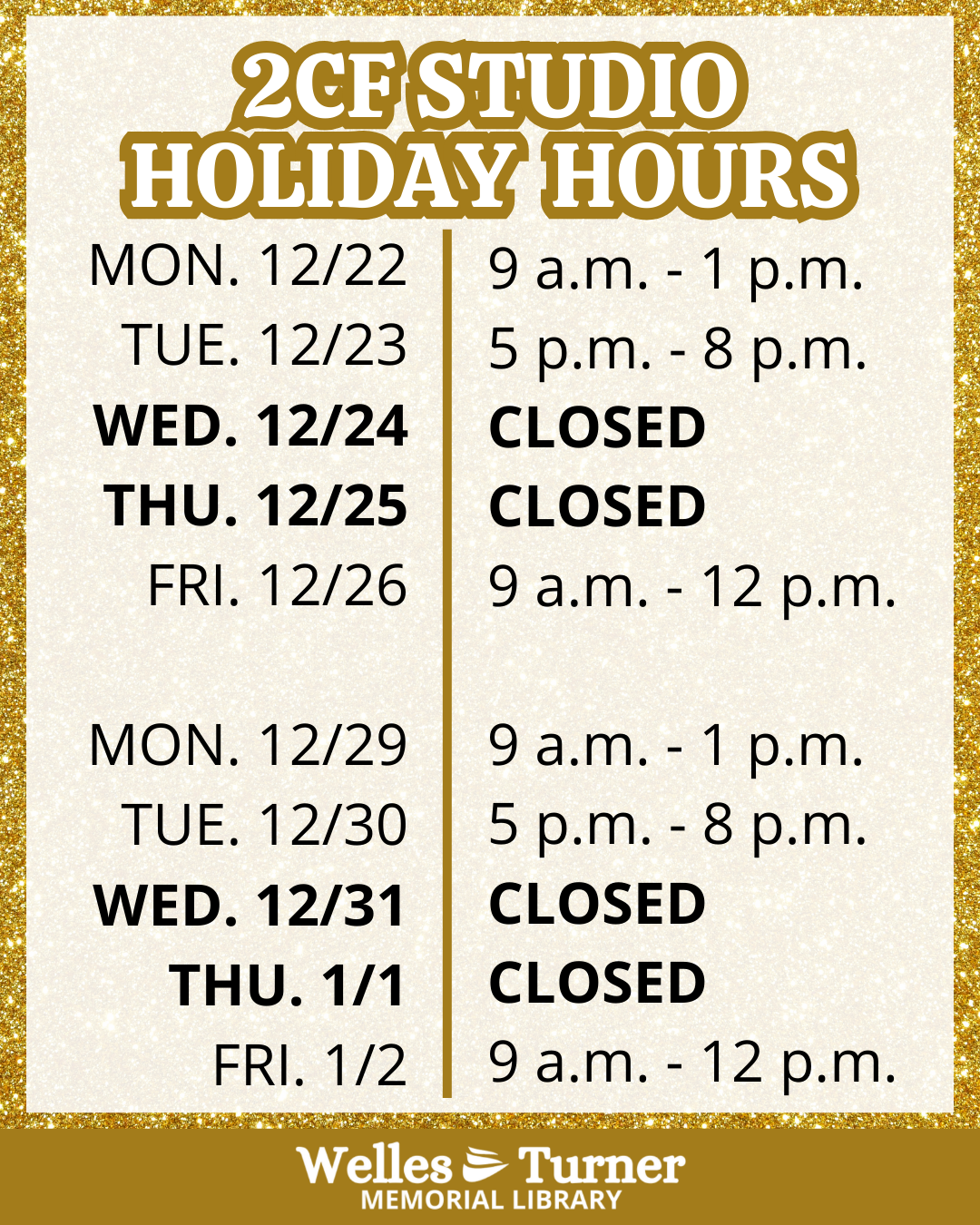 Monday 9 am - 1 pm 2CF Studio hours are subject to change based on staff availability and programs scheduled in the space. Please check the Library calendar and/or website for updates and changes to the open hours schedule. |