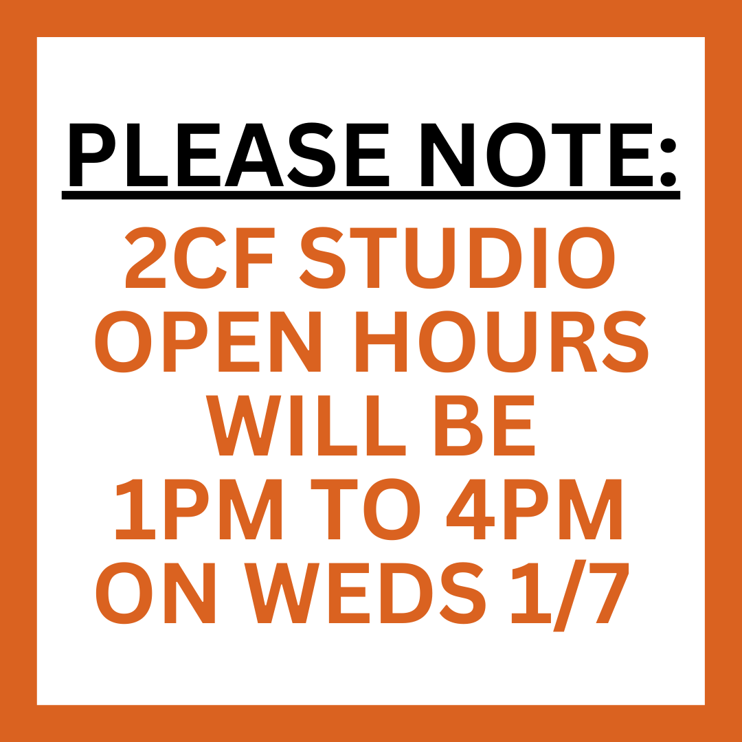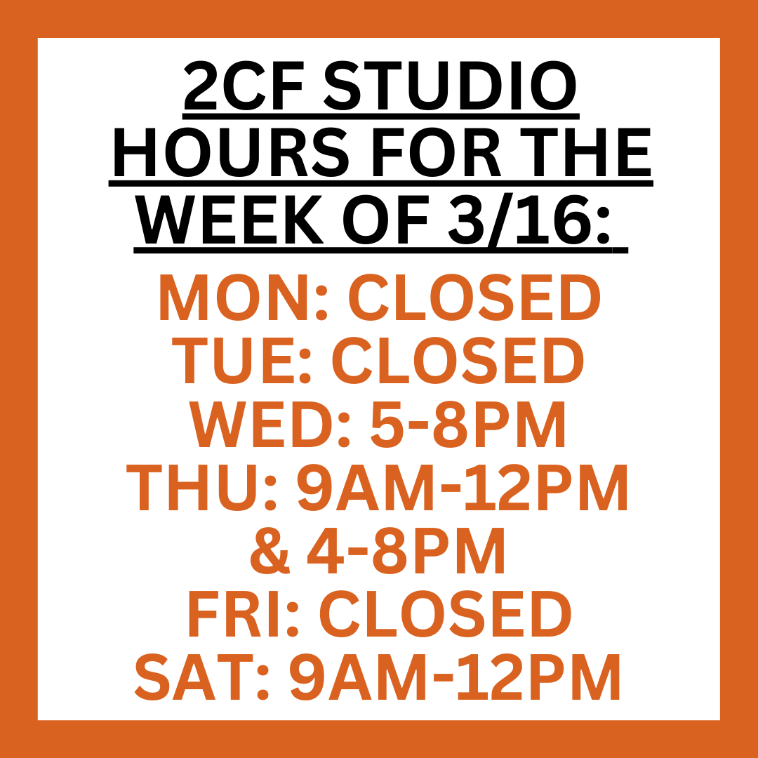 Monday 9 am - 1 pm 2CF Studio hours are subject to change based on staff availability. |